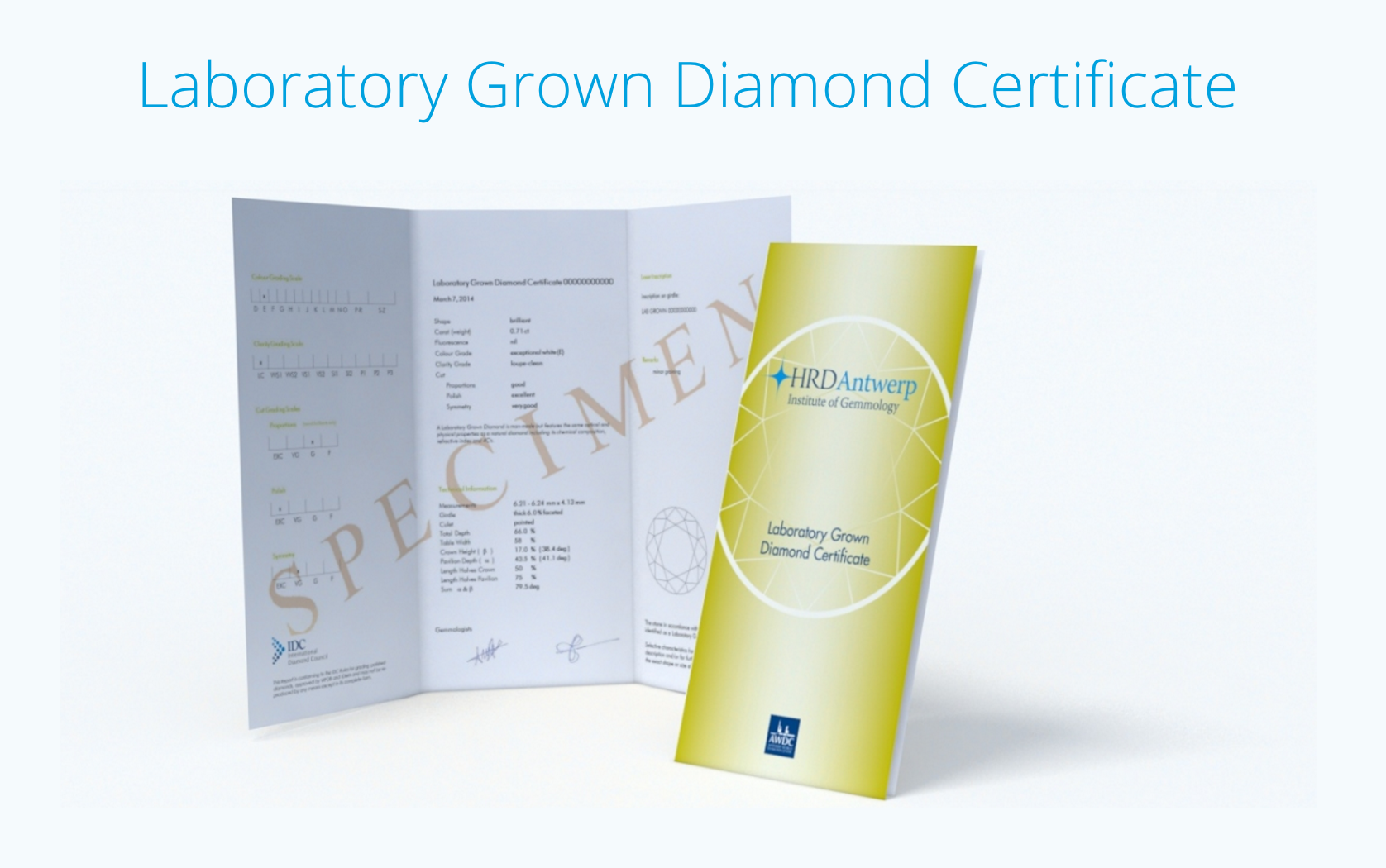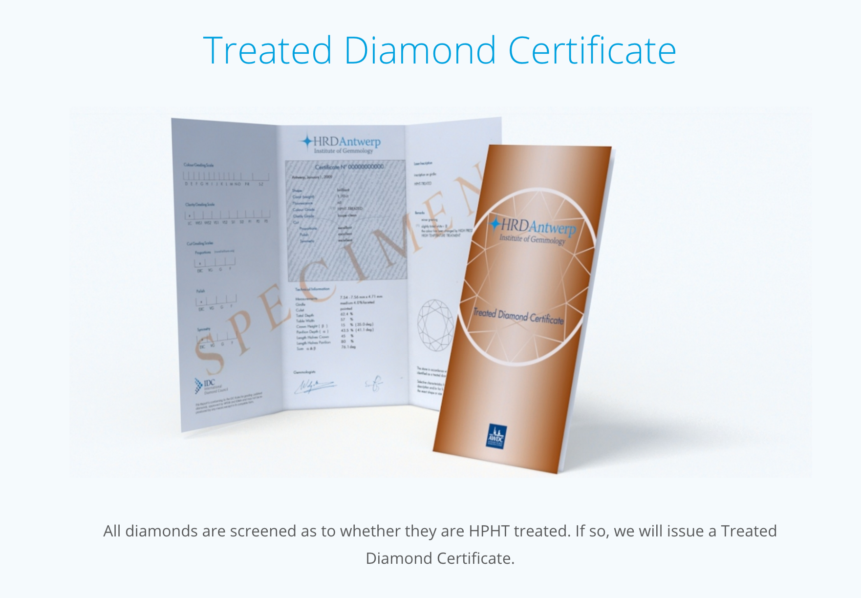 - Tại phòng kiểm định HRD, Chứng thư kiểm định của Kim Cương Màu Nhân Tạo sẽ ghi rất rõ là Treated Diamond Certificate - Kim cương đã được xử lý, và Labarotary Grown Diamond Certificate - Kim Cương nhận tạo được tạo ra trong phòng thí nghiệm