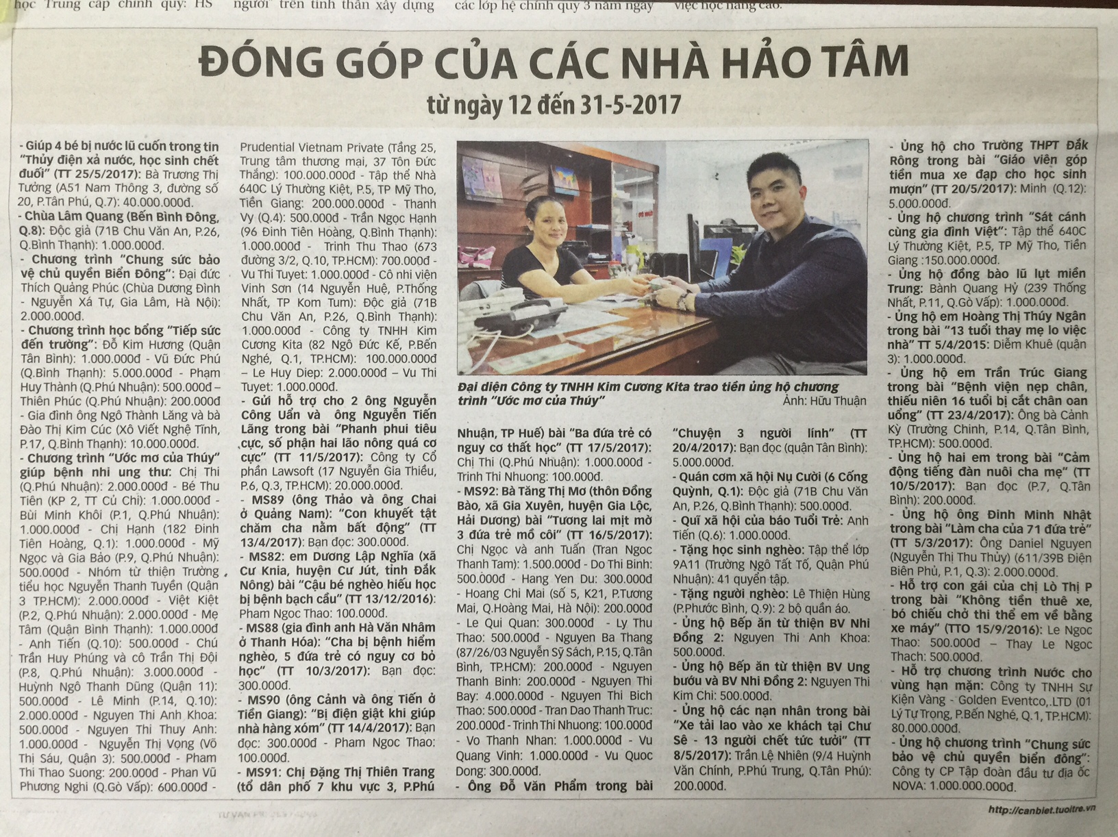 Ngày 31/5/2017, Ông Nguyễn Thành Long, đại diện Công Ty TNHH Kim Cương KITA đã trao tặng 100 triệu đồng cho chương trình Ước mơ của Thúy giúp bệnh nhu ung thư năm 2017 của báo tuổi trẻ